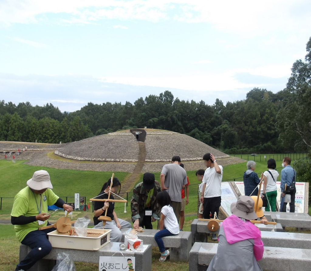 イベント会場ではボランティアの皆さんによる古墳の説明や勾玉作り、火おこし体験のほか、