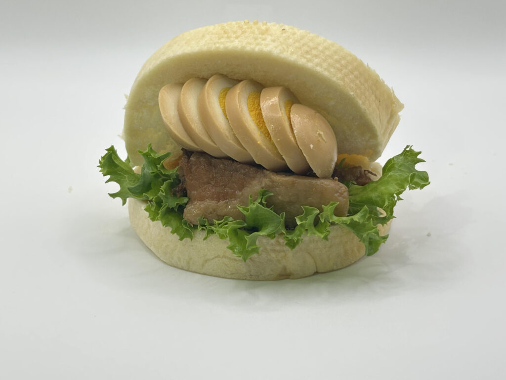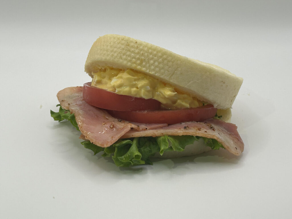 丸い食パンの中には、自家製の豚の角煮をサンドした看板メニューの「豚の角煮サンド」や卵サラダやベーコン、