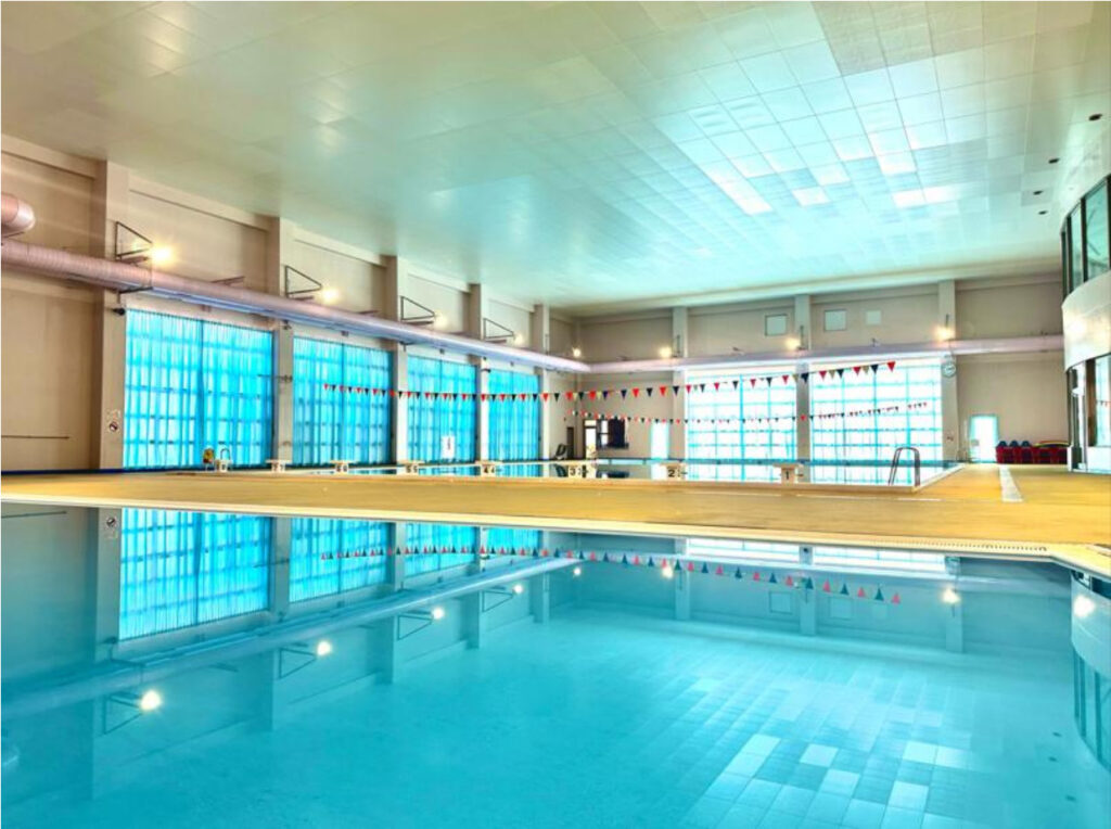 最大の自慢は天井の高い大アリーナ(33m×35.5m)と温水プール。