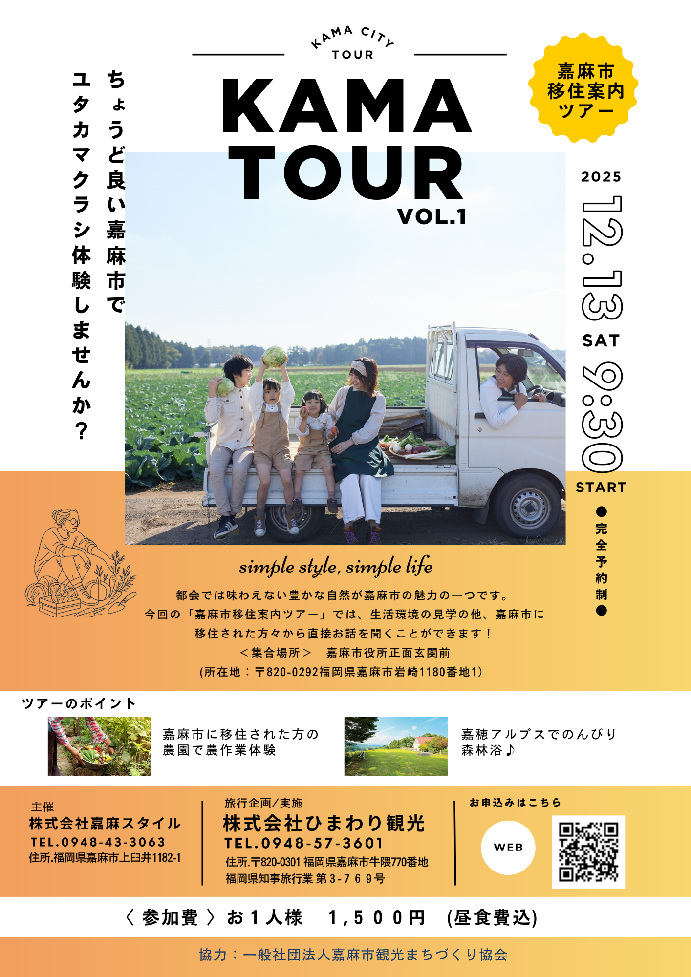 株式会社嘉麻スタイル(本社:福岡県嘉麻市、代表取締役:廣田康一)は、嘉麻市への移住者を増やす取り組みとして、一日嘉麻市民になりきり生活環境を見学&体験できる『嘉麻市移住案内ツアー』を2025年12月13日(土)に開催いたします。